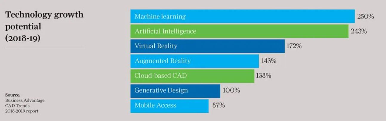技术增长潜力(2018-2019)。来源:商业优势CAD趋势2018-2019报告
